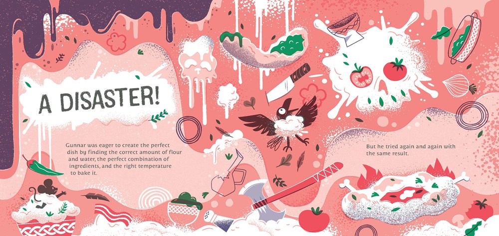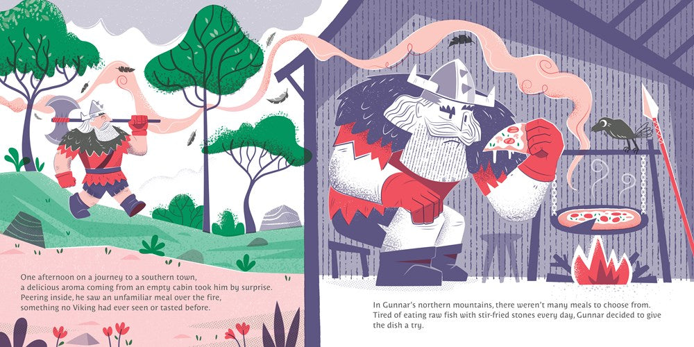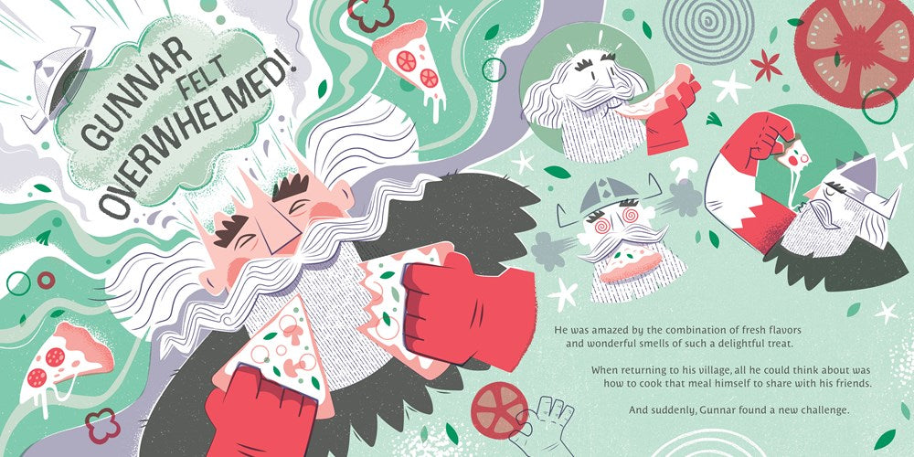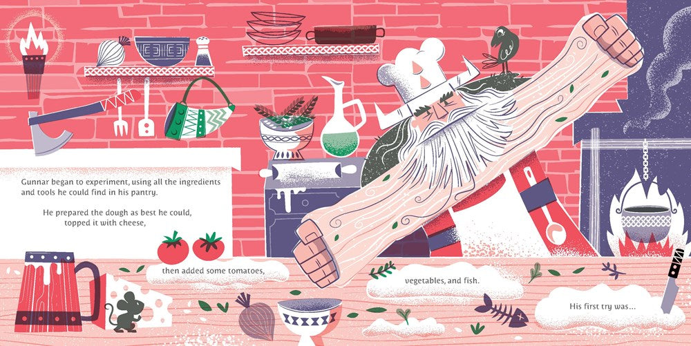 During a voyage to a southern town, Gunnar's destiny took a turn when he smelled a delicious aroma coming from an empty cabin. Inside, he discovered a wonderful treat that completely overwhelmed him: Pizza! When he returned home, Gunnar tried to recreate the recipe. His first Viking pizza was born, and it was … a disaster.