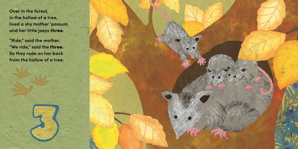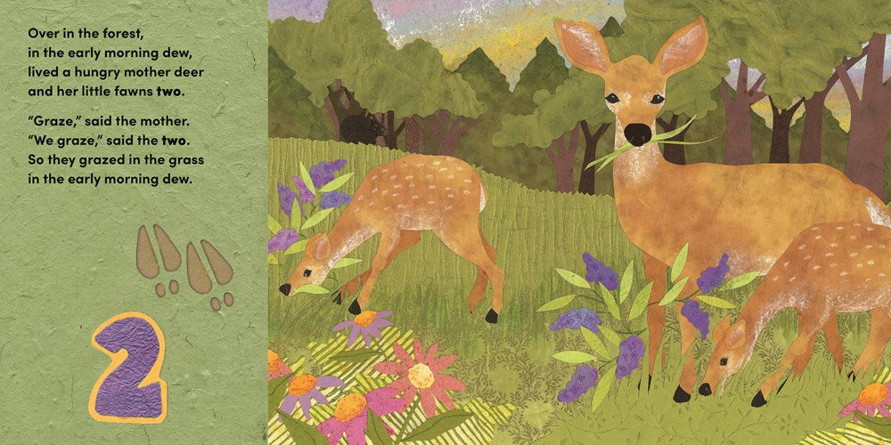 Follow the tracks of ten woodland animals but . . . uh-oh . . . watch out for the skunk! Children learn the ways of forest animals to the rhythm of “Over in the Meadow” as they leap like a squirrel, dunk like a raccoon, and pounce like a fox. They will also count the babies and search for ten hidden forest animals. Cut paper illustrations add to the fun in this delightful introduction to a woodland habitat. Once again, Marianne Berkes makes learning fun. Kids will hide, graze, and pounce as they imitate and count the animals.