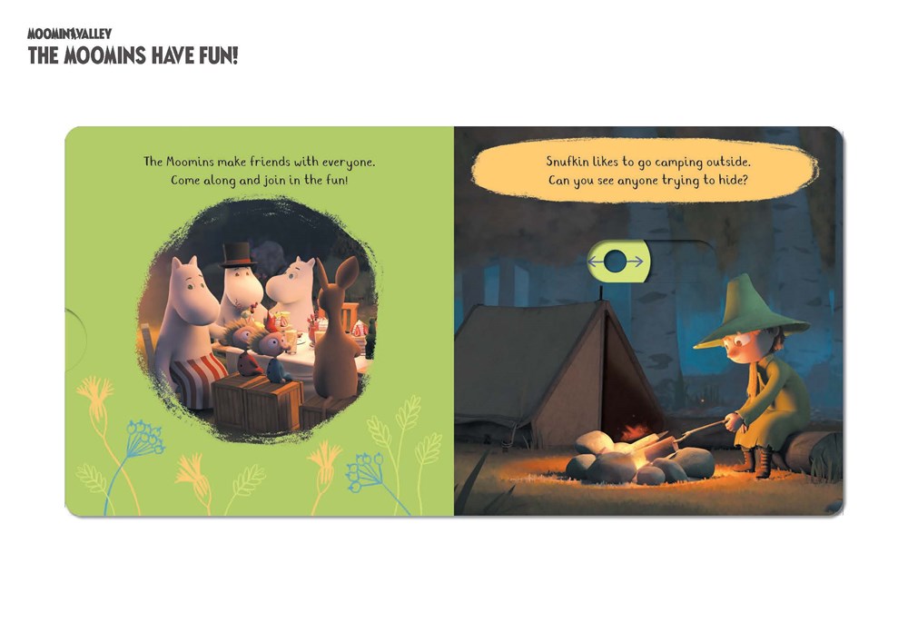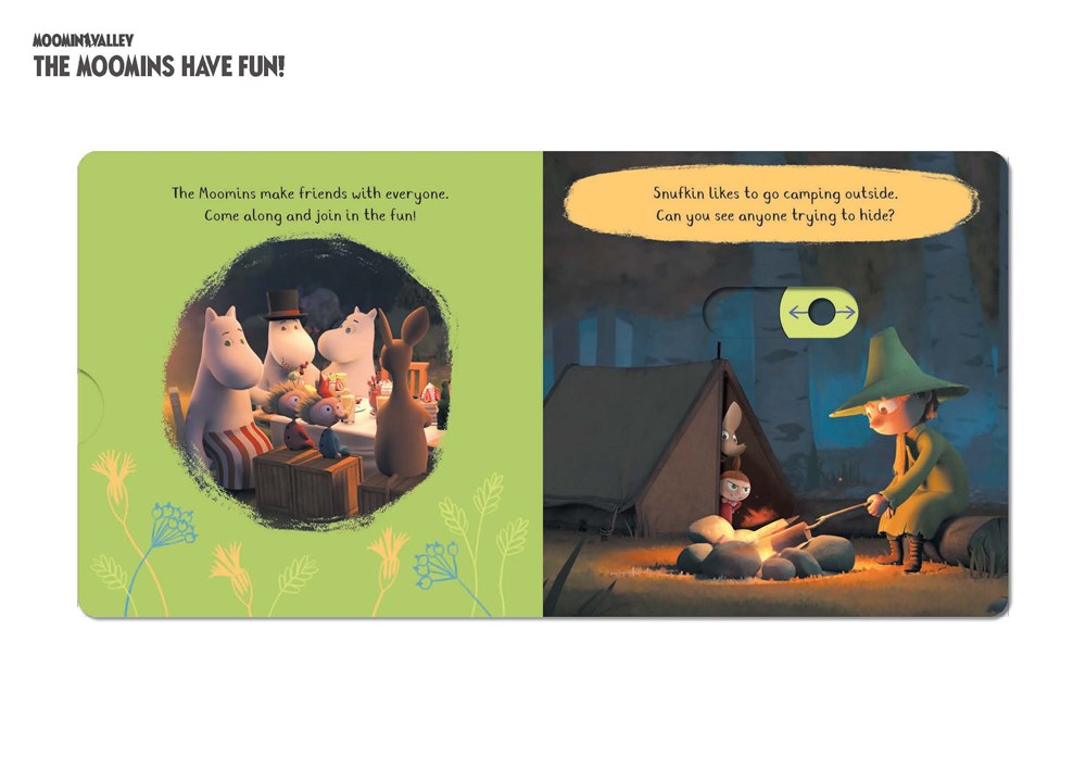 Push, pull and slide the tabs in this magical Moomin book and make all your favorite characters come to life! Sail across the ocean with Moomintroll, camp in the woods with Snufkin, and fly high in the air on a colorful kite. With the Moomins, the adventures never stop!