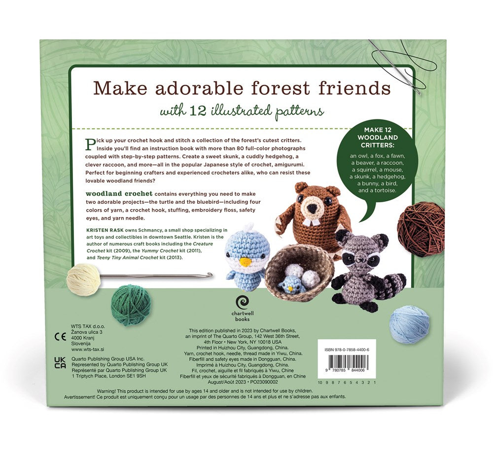 Crochet your own adorable forest friends! This fun kit includes a 76-page instruction book and materials to make two projects, a sweet turtle and a beautiful bluebird. Pick up your crochet hook and stitch a collection of the forest’s cutest critters with Woodland Crochet Kit . Inside you’ll find an instruction book with more than 80 full-color photographs coupled with 12 step-by-step patterns . Create a sweet skunk, a cuddly hedgehog, a clever raccoon, and more—all in the popular Japanese style of crochet, amigurumi. Materials include: